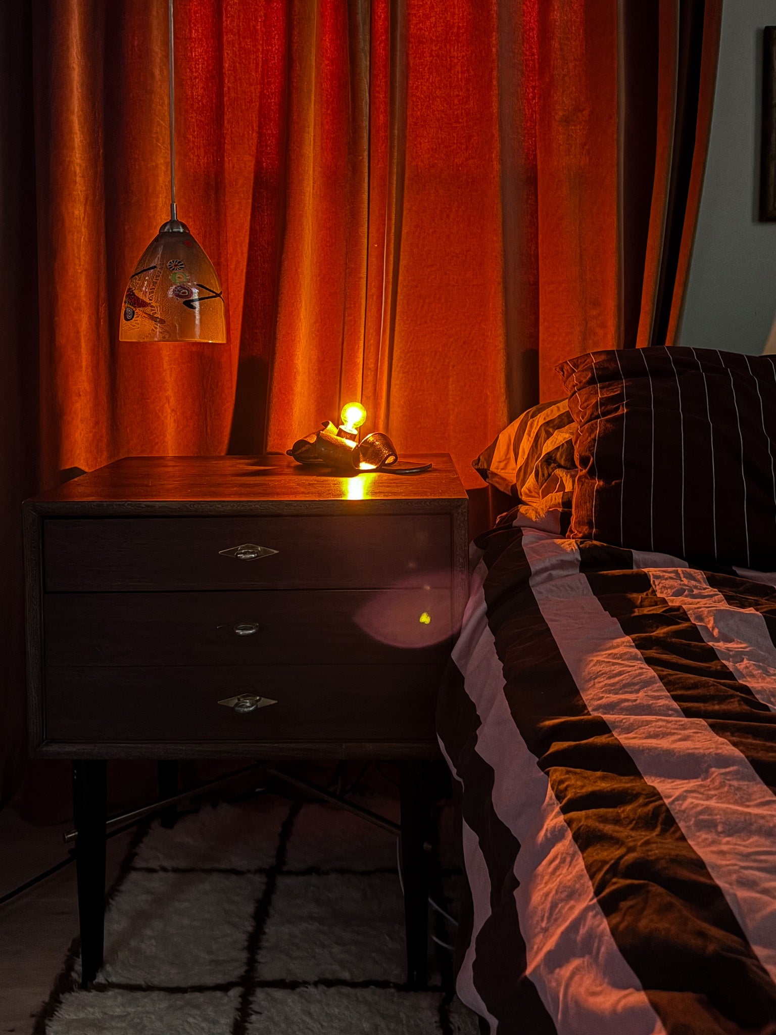 Handmade Flop Lamp in mineral heavy warm brown clay and Ohata Red glaze, making a beautifully speckled surface texture. Matching brown cloth covered twisted cord and amber bulb.