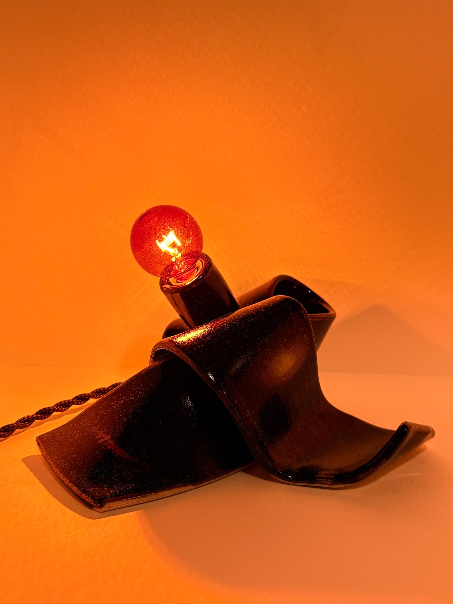Handmade Flop Lamp in stoney white clay and speckled black glaze, matching black/brown zig-zag cloth covered twisted cord and amber bulb.