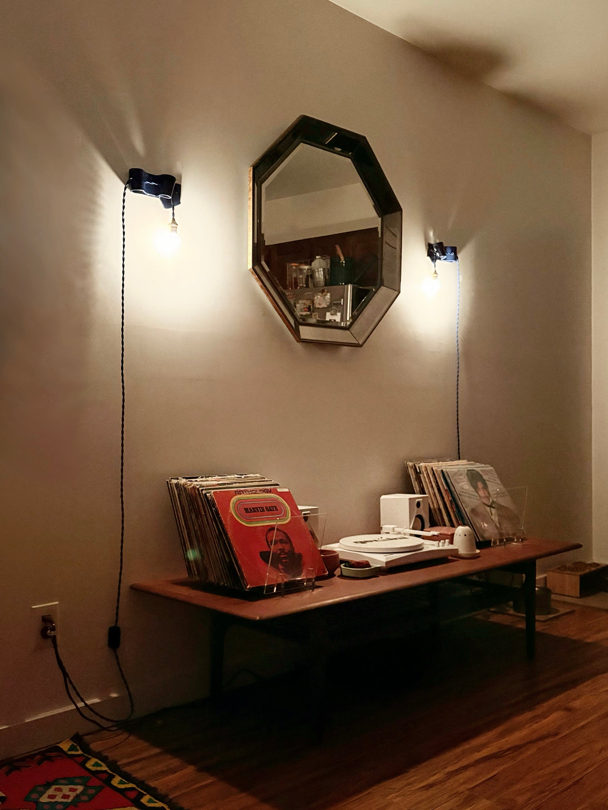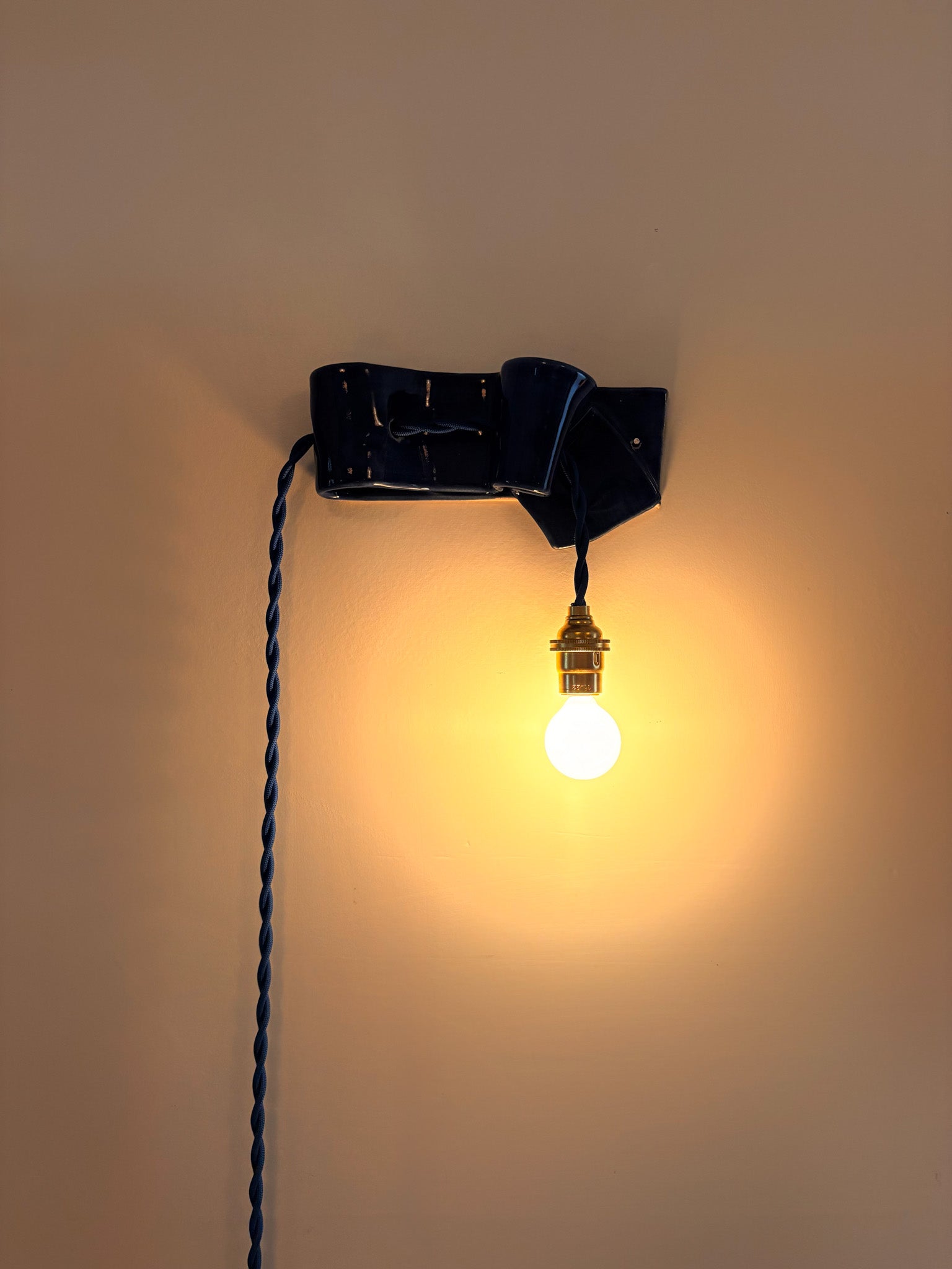 Handmade plug in Flop Sconce in stoney white clay and cobalt blue glaze. Matching cobalt blue cloth covered twisted cord with rocker switch. A frosted white bulb hangs from an unlacquered brass socket.