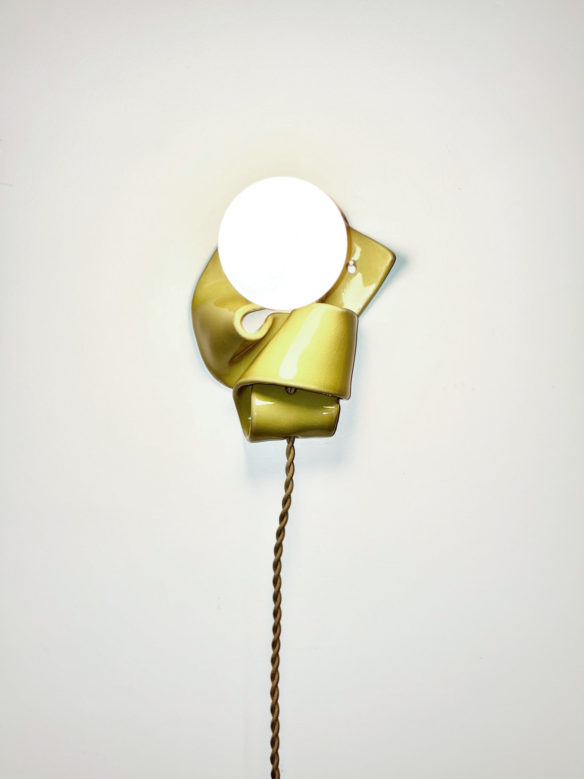 Handmade plug in Flop Sconce in stoney white clay and bringle yellow glaze. Matching burnt yellow cloth covered twisted cord with rocker switch and 3" frosted white globe bulb.