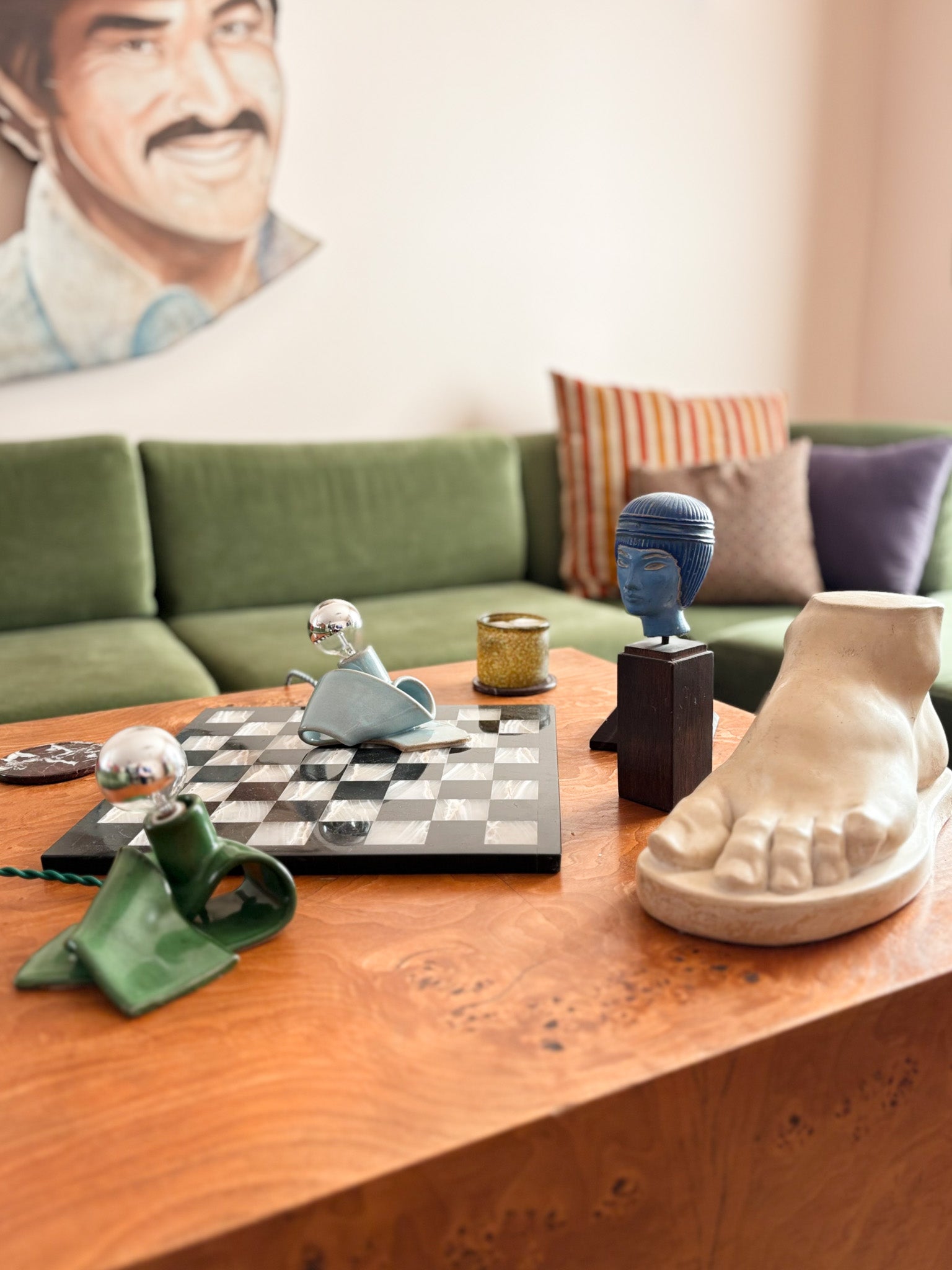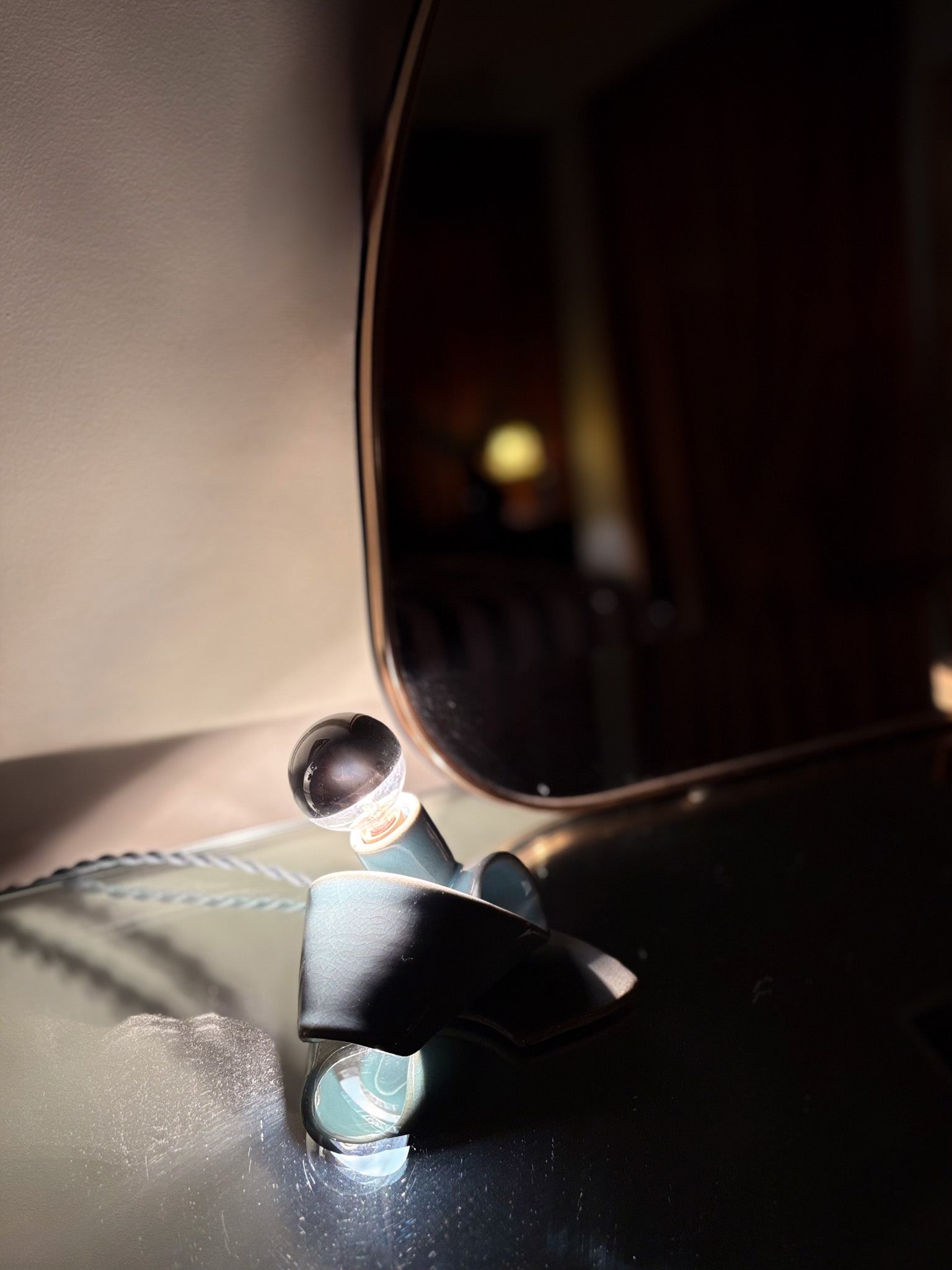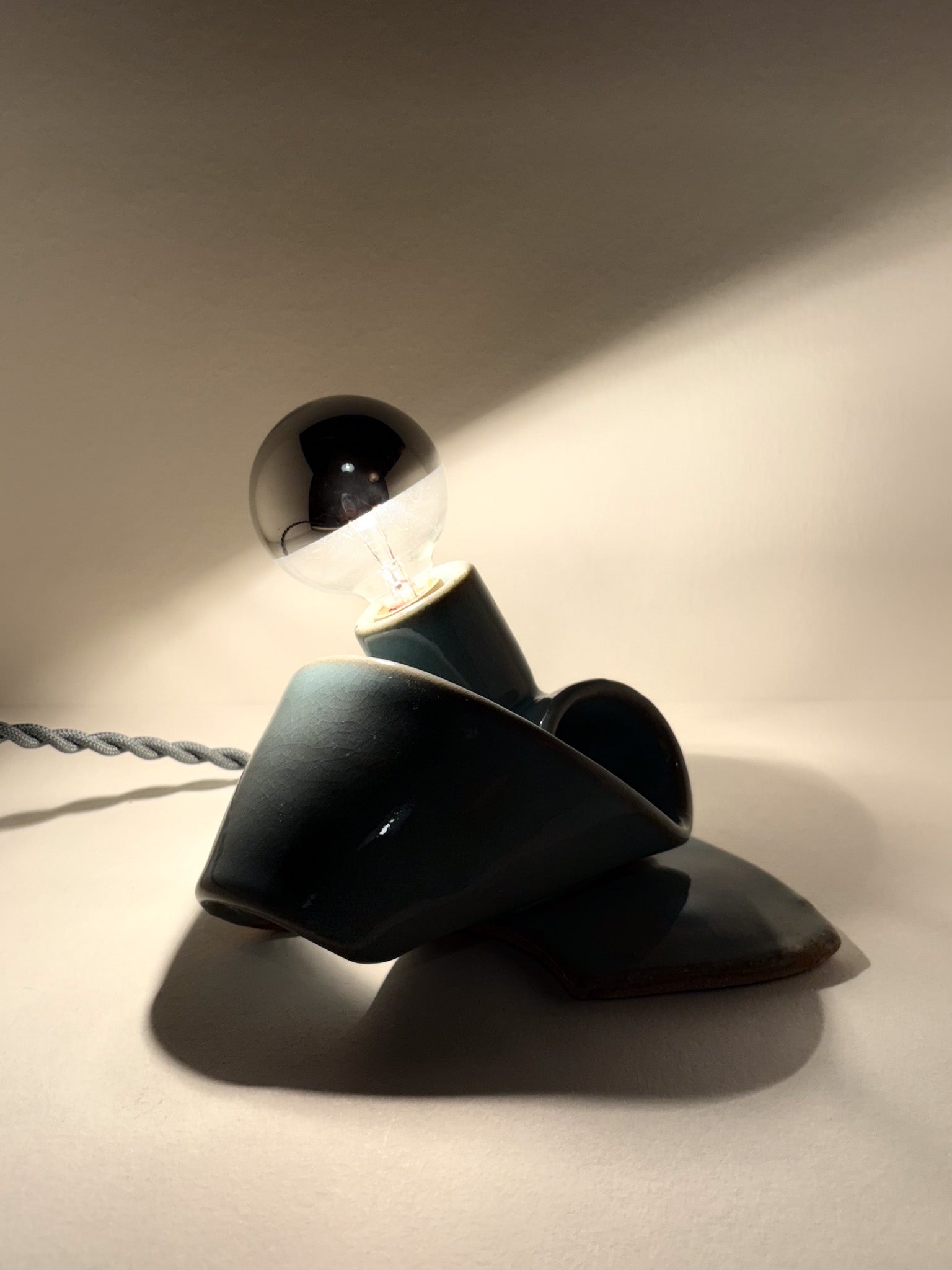 Handmade small Flop Lamp in stoney white clay and baby blue glaze, matching baby blue cloth covered twisted cord and half chrome bulb.