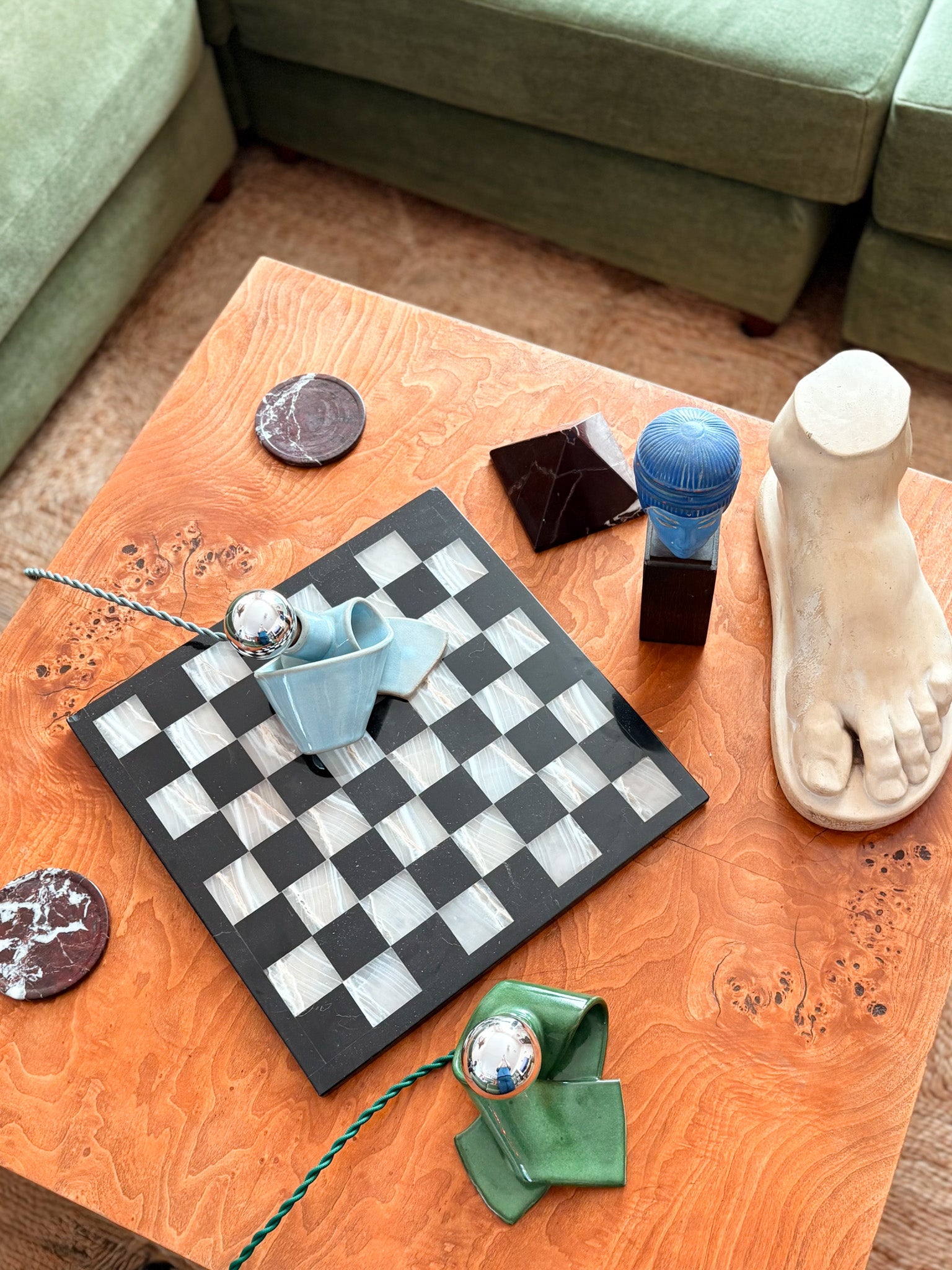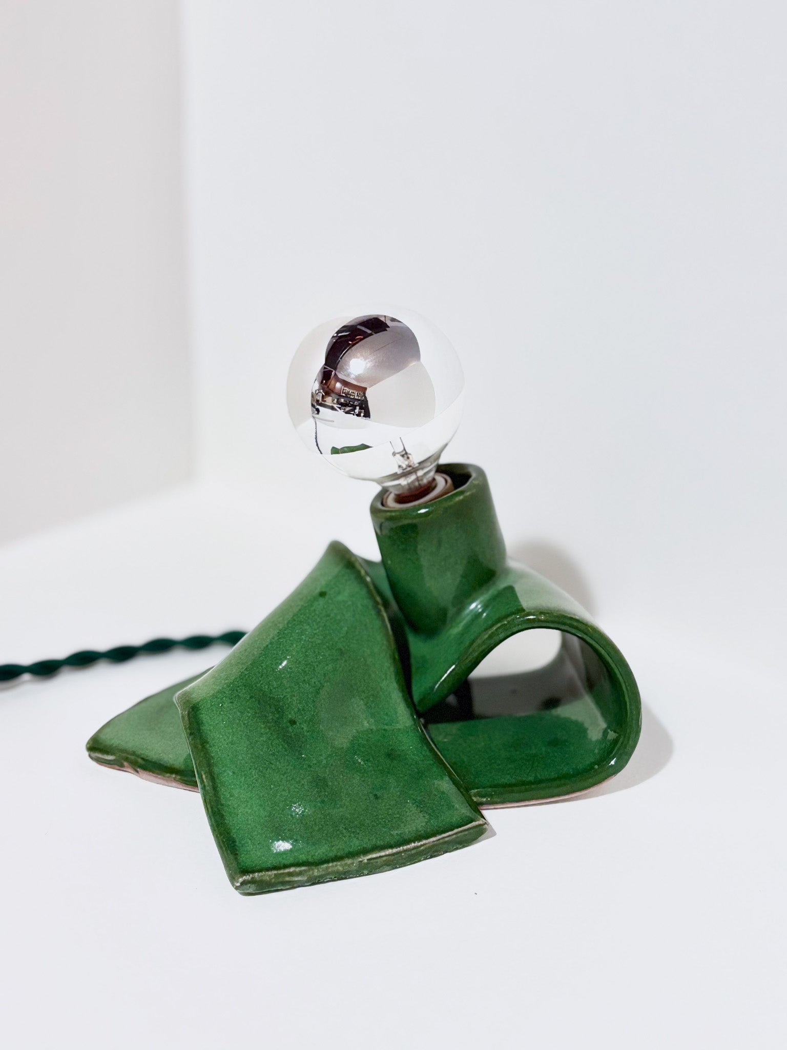 Handmade small Flop Lamp in stoney white clay and Pellegreeno glaze, matching green cloth covered twisted cord and half chrome bulb.